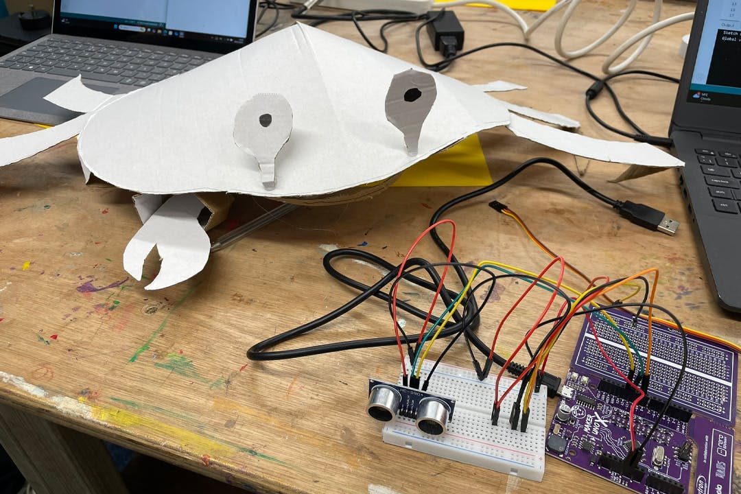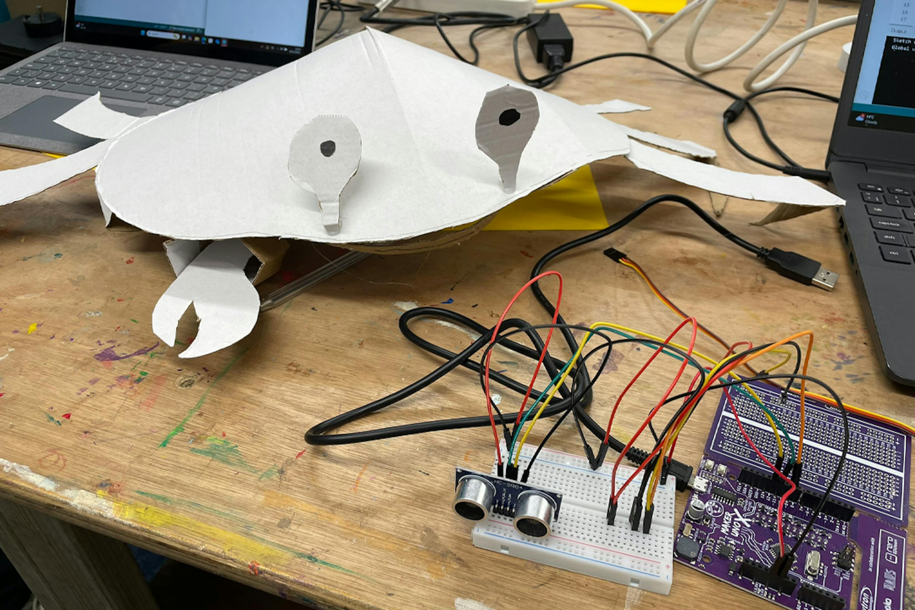 The challenge on the digital side is that many of the learners do not consider themselves to be technical, and may have had negative experiences with traditional forms of education. I led the sessions in an informal workshop style, with a focus on overcoming fear, and seeing results, with limited in-depth exploration of the technologies and techniques. In this way we could move through discovering the possibilities and limitations of Arduino's and their use in control, while considering how they might be useful in each individual's project goals. By the end of the first six weeks we had considered a number of ways we can sense movement and presence and use these with different types of motor to make art works move. Now into the second phase, I am working with the learners to get their creations ready for a showcase event in February 2026, where they are learning to flex their creative concepts in the light of practical constraints.