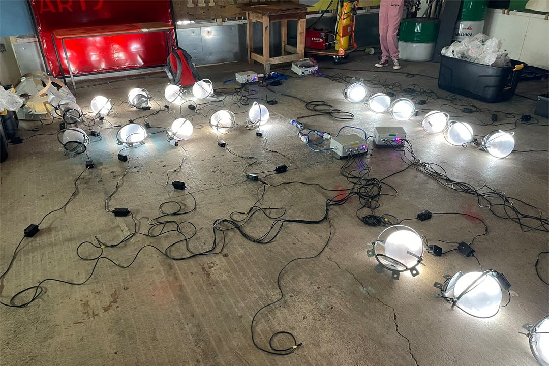 As a feasible technical design emerged we had to make sure power needs, safety, easy build and take-down and weatherproofing were all designed in. With a design nailed down, we had to work on scaling up - building 24 orbs (plus spares), and power supplies. My very capable creative technology intern, Robbie Linsdell, was able to ramp up production, with help from the other interns. We had a final test, with orbs attached to the sculpture a week before the festival opened, with just enough time for packing down and strapping on the trailer for its long road trip to the far side of Czechia.